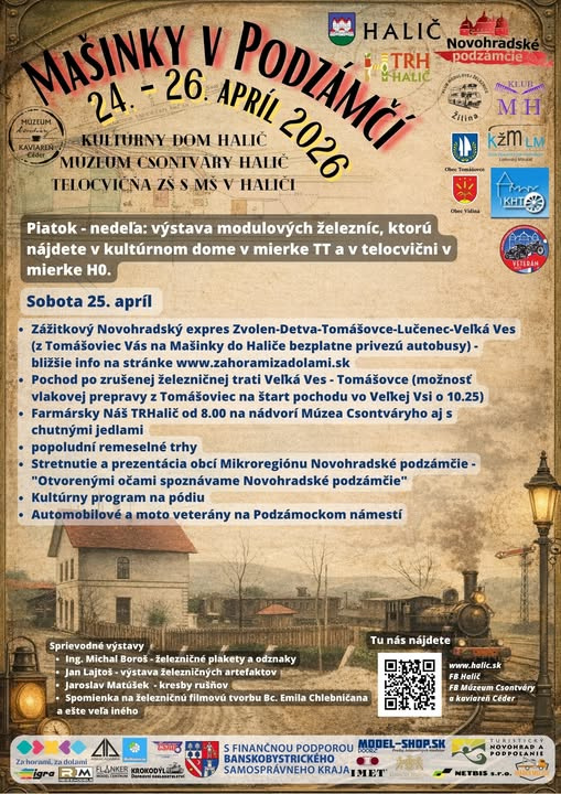 Prvýkrát bude na mašinky vypravený aj historický špeciál zo Zvolena v spolupráci s Rozvojovou agentúrou BBSK. Poznačte si teda do kalendára termín 24. - 26. apríla 2026. V sobotu 25. apríla bude program bežať aj mimo vnútorných priestorov, pretože od rána bude podujatie spojené aj s potravinovým Trhom Halič a popoludní so stretnutím a prezentáciou obcí nášho Mikroregiónu Novohradské podzámčie aj s bohatým kultúrnym programom v areáli obecného múzea.
